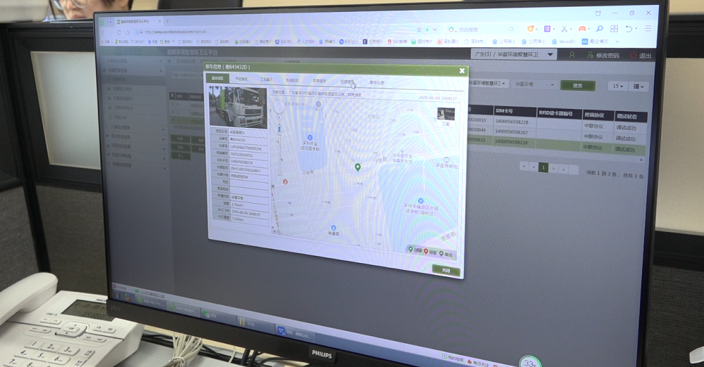 其中,通过在环卫车辆上安装GPS定位、摄像头,实现道路清扫保洁、垃圾清运、环卫设施、环卫车辆、环卫事件、工作考核、协同办公等综合性监管,获取监管对象的状态、作业数据、作业轨迹、远程监控视频等,以全景地图方式展示车辆、设施、线路、作业区域,实现人、车、事、物的全时段、全方位的监管,提升调度能力,加强作业现场反应能力。